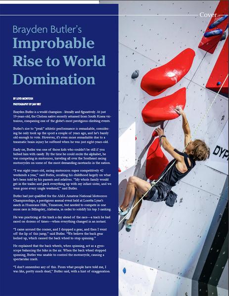 Brayden Butler is a world champion - literally and figuratively. At just 19 years old, the Chelsea native recently returned from South Korea victorious, conquering one of the globe's most prestigious climbing events.